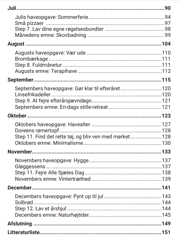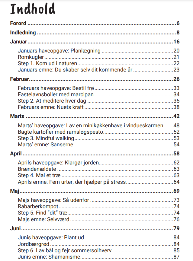 Bogen er struktureret efter kalenderåret og giver konkrete forslag til, hvad man kan lave i naturen, hvilke råvarer der er i sæson, og hvordan man kan bruge dem i madlavningen. Hver måned præsenteres med idéer til aktiviteter, opskrifter og refleksioner, der understøtter en mere mindful livsstil. For dem, der føler sig stressede eller udbrændte, kan denne bog være en overskuelig vej til at genfinde balancen – én måned ad gangen.